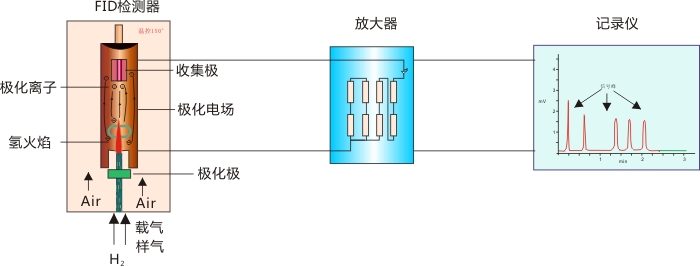 揮發(fā)性有機物在高溫氫火焰中燃燒時,發(fā)生高溫電離,反應(yīng)產(chǎn)生的電子在電場的作用下被收集,形成微弱的電離電流,電流強度與被測組分的濃度成正比。